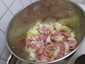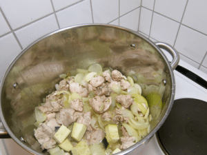 When the onions are tender, bring the heat down to medium and add the chicken pieces. Season the chicken with salt and pepper, stir them around, and then put the lid on the pot.