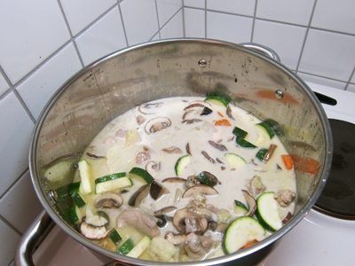 After about 10 minutes when the outer part of the chicken pieces appear cooked (although not fully cooked through), I add more the chopped eggplant and carrots. Cover; if your burner is really hot even on medium, bring the heat down some more. Our stove in Stockholm is not very complex, so I just try to keep it on a little higher than a “low” setting. After about 10 to 15 minutes, or when the eggplants seem to have softened, add the rest of the vegetables — mushrooms, zucchini, and cauliflower. Again, put the lid on. As the vegetables cook down, they will release a lot of water, which is just fine — I think of it as “vegetable broth” that will add flavor to the curry.