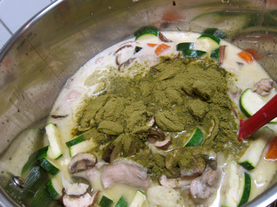 Add green powder to the curry. I use 3 generous tablespoons for a pot of this size.