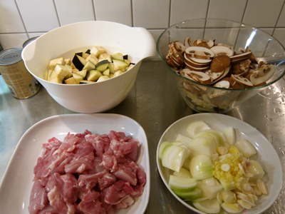 I like to prep the ingredients in groups of items that should be cooked together. Here, onions, garlic and ginger are on one plate together, as they will cook first. Then, I have a plate of chicken thighs, cut into about 1.5 inch pieces. And then in the back (left), I have a bowl of vegetables that take a little longer to cook — chopped carrots and eggplant. In the final bowl (back-right), I have vegetables that cook a little quicker — sliced mushrooms, chopped cauliflower, and chopped zucchini.