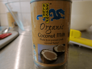 After about another 10 minutes, add coconut milk. I use 2 cans for a large pot. If you can, I highly recommend buying good quality, organic coconut milk. I find coconut milk vary greatly in quality, and will very much alter the flavor of the curry. We found this Blue Dragon brand in Stockholm, which is delicious.