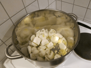 In a large pot, heat some coconut oil on medium-high heat. When heated, add onions, garlic and ginger. Add a pinch or two of salt, and stir with a wooden spoon.