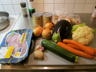 Green curry makes a great Sunday meal. I have made green curry the last couple of Sundays in Stockholm, in part because Sunday is our day off and I have more time to make dinner. Although green curry is easy (especially equipped with a fabulous-and-easy-to-use curry powder), there is a lot of chopping and prepping required. I like to lay out everything I’m going to use, so that I don’t forget anything I’d planned to put in the curry. The wonderful thing about curry is that you could put almost any kind of vegetable in it — it’s a great way to use up that half a cauliflower you need to eat, for instance. My basic go-to vegetables for green curry are onions (about 3), eggplant (1 large), cauliflower (half a head), carrots (about 3), zucchini (1 large), and mushrooms (a good amount — we love mushrooms!); I always use a few cloves of garlic and a thumb-sized piece of ginger, too (both garlic and ginger finely minced). For chicken curry, I use skinless chicken thighs (about 2 lbs).