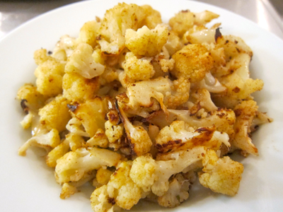 Preheat the oven to 375F.  Break down the cauliflower into about 1 in. florets and put them in a bowl.  Add sliced garlic (about 3 cloves), add a tablespoon of ground cumin, and a teaspoon of cayenne pepper (or about 1/2 tsp if the cauliflower is small — you can vary depending on your spiciness tolerance); season with salt and pepper.  Drizzle with some olive oil and mix well.  Lay out the cauliflower in a baking dish and roast for about 25 minutes, or until tender.  Move the cauliflower around occasionally so that they brown evenly.