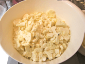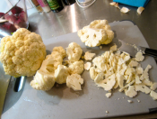 The soup itself is very simple. First, break down the cauliflower into small pieces.