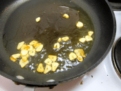 Heat about 3 tablespoons of olive oil in a pan. When hot, turn down the heat to medium-high and fry the sliced garlic, turning frequently with a heat resistant spatula (or whatever with which you feel comfortable).