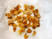 When golden, take the garlic chips out and lay them out on a paper towel over a plate. Sprinkle with some sea salt.
