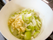 Heat olive olive (about 1 tablespoon) in a large pot on medium-high heat. When the oil is hot, add the onions and garlic. Turn down the heat to medium. Salt generously, and saute the onions and garlic, make sure to keep stirring to make sure that they don’t burn at all (**important to make sure the soup retains a nice, creamy white cauliflower color).