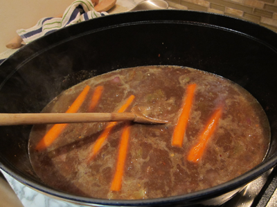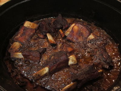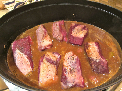 Place the lid on the dutch oven, and braise in the oven (at 300F) for 2 hours. (I turned the ribs around after 1 hour, to ensure both sides get immersed in the broth.)