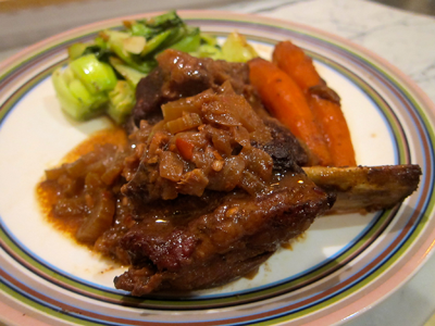 I recently came up with this simple, flavorful way to braise short-ribs — I wanted to give the short-ribs somewhat of an “Asian” flavor profile, involving soy sauce and ginger. I ended up experimenting with various spices I had on-hand at home, and we were very happy with the results! The broth cooks down to make a wonderful “sauce”; the carrots were delicious, and David has asked me to make sure to use more carrots next time. The dish packs a lot of flavor — some heat, lots of spices, and even some sweetness from the cooked-down onions as well as cinnamon and cloves. A great hearty dish, perfect for winter. Next time, I’d like to add some star anise into the mix.