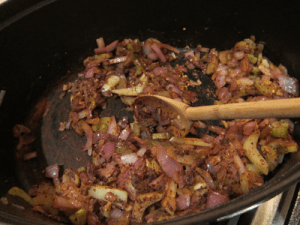 Drizzle some olive oil in a dutch oven and heat on medium-high heat. Saute the red onions, garlic, and ginger. Salt to sweat the onions.