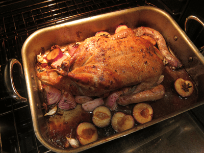 Put the duck in the oven. Roast at this temperature (425F) for 45 minutes — after the first 15 minutes, add a cup of water to the roasting pan (which will deglaze the bottom of the pan). Baste the duck every 10 minutes or so for the remaining 30 minutes.