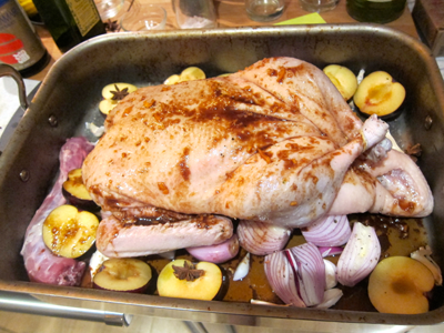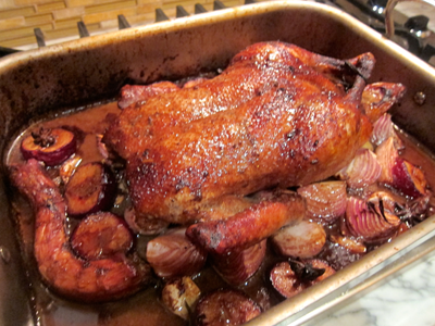 Place the duck over the red onions and shallots. Place the whole orange (pierced) in the cavity. Place the plums, garlic cloves and star anise around the duck.