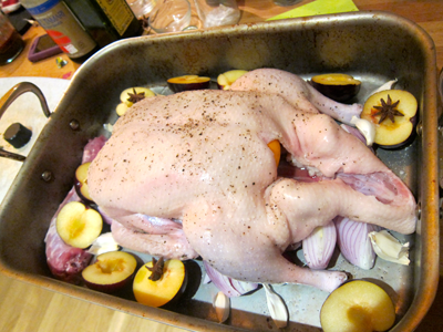 Sometimes, we find ourselves in a little protein rut. What else can we eat besides beef, chicken, pork and fish? Last night, David and I went shopping at Whole Foods and felt such a rut. What protein should we eat for dinner? When we saw a whole duck (last one, it appeared) and some lovely looking organic black plums,we found our inspiration and challenge: whole roast duck with black plums and spices!