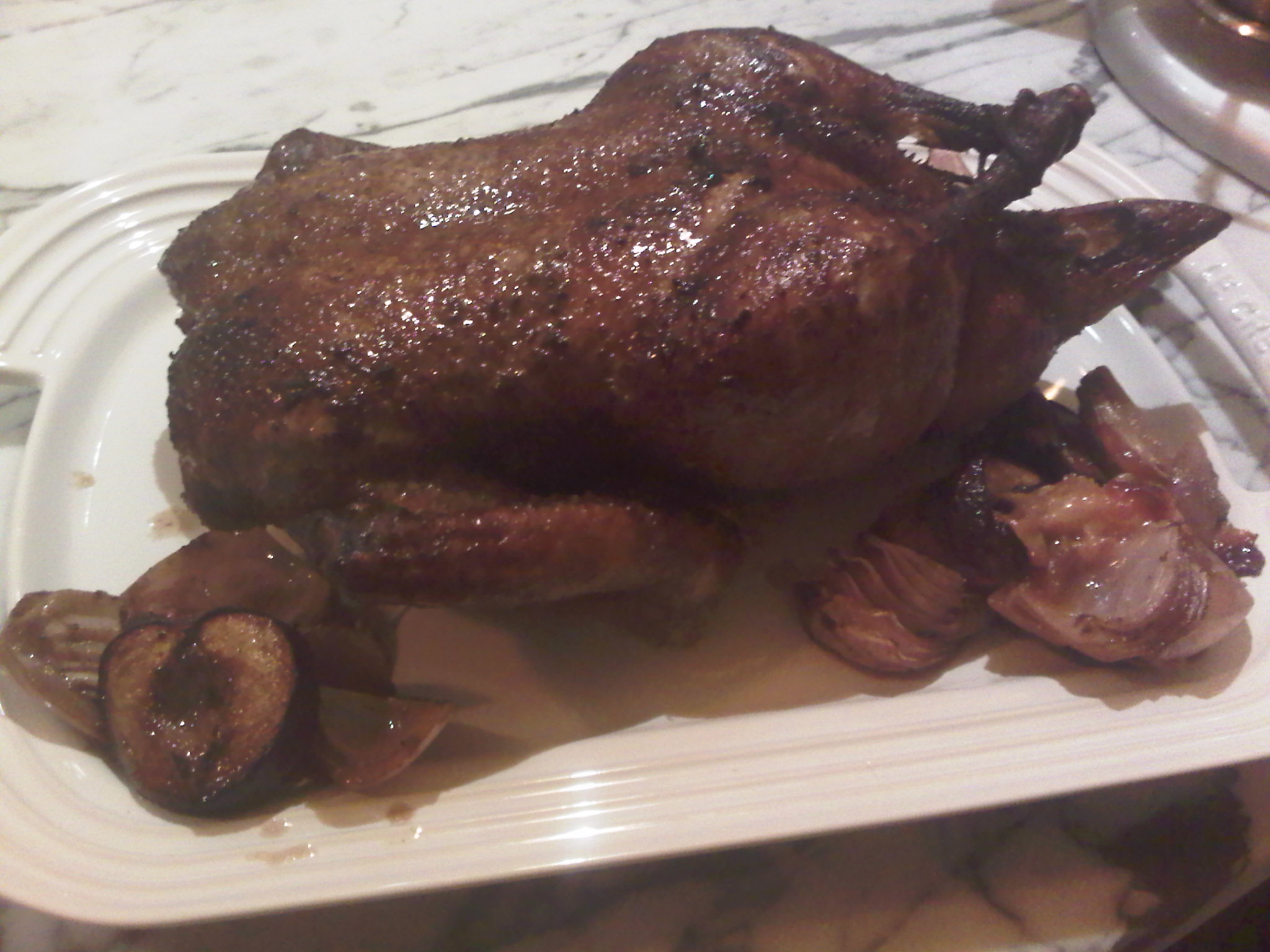 The habañero in the marinade adds a nice, subtle heat to the dish, which works nicely with the spices and the orange juice also in the marinade. Although I hope to improve on this recipe when I make it next — I want to make the duck skin crispier — we loved the result! This new, slightly improvised recipe is David’s new favorite version of a whole roast duck!