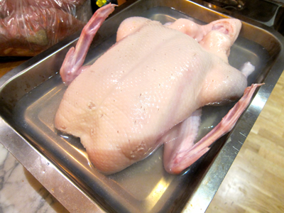 Boil 2 cups of water. Clean and pat dry the duck; cut off any excess fat around the neck and cavity . With a sharp, small knife, pierce the skin all over. Put the duck in a pan, and pour the boiling water all over the duck to shrink the skin.