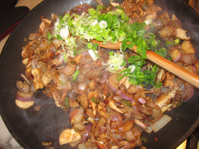 Once the eggplants are tender, add the mushrooms. Finally, when everything is cooked and tender, add the soy sauce, mirin, and scallions, and stir well. Set side.