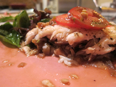 Cut and serve like you would a square pie (or a lasagna). I sliced tomatoes from our garden, and served it with a simple green salad. Here’s what the Sole “Pie” looks from the side: