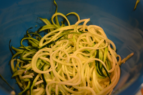 **For the zucchini “pasta,” I used 2 zucchinis and spiral sliced them with the 2 x 3 mm setting. I then pan-sauteed the zucchini ribbons with a drizzle of olive oil and lightly seasoned them with salt and pepper. Cook the zucchini ribbons until just tender — don’t over cook! — about 5 minutes.