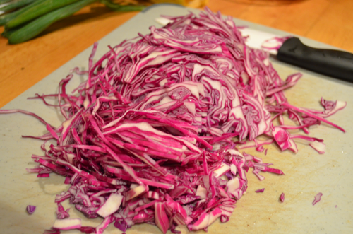 - 1/2 red cabbage, julienned