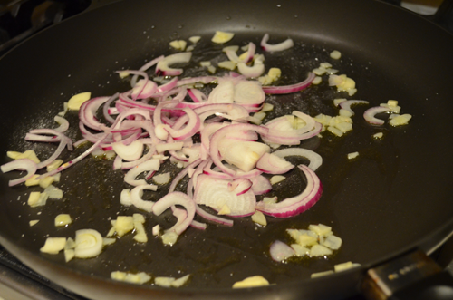 In a pan, heat some olive oil and add the onions and garlic. Salt and cook until the onions soften.