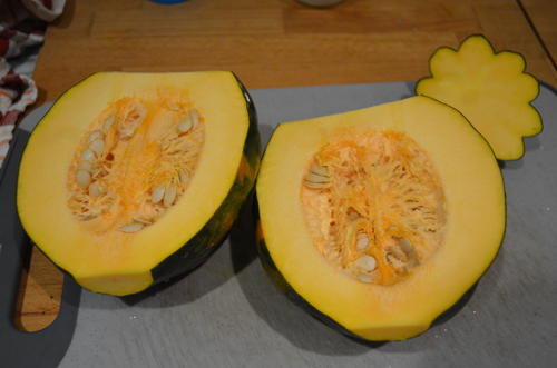 I like to get organic acorn squash, because I keep the skin on, which I think is delicious roasted. And here’s how I roast them: