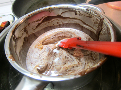 When the chocolate melts, add a can of coconut milk (400 ml).  Keep mixing and heating the mixture until the it is completely smooth and silky in texture.  (It’s important to heat the coconut milk with the chocolate and make sure to mix well to achieve smooth creamy texture.  I use a spatula to keep mixing and scraping the sides, until the chocolate runs smooth.)  Add about 1/4 cup of sweet sherry (or another sweet wine) into the mixture.  The sweetness from the dark chocolate and the sweetness from the wine will act as the sweeteners for the pot du coco(nut).