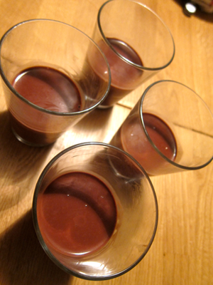 Pour into small glasses — I will make about 8 small portions (or 4 large portions in mugs).