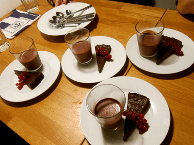 When I make flourless chocolate cakes, I use a recipe I found on Food52 by ChezUs.  Normally, I use Stevia to sweeten the cake, instead of regular sugar.  On this occasion, I skipped any kind of sweetener because (1)  we haven’t found Stevia in Stockholm and (2) I thought that a less-sweet, almost bitter cake might pair better with the “Pot du Coco(nut),” which is creamy and decadent.  I will post the recipe for the cake later.