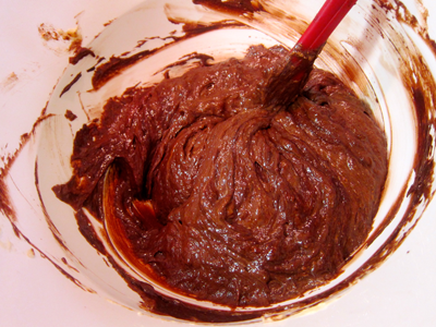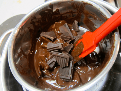 Melt 2 bars of dark chocolate in a double boiler (about 7 o., or 200g — I use 81% cacao).  If you don’t have a double boiler (I don’t) you can use two pots, one small pot to heat water, and a small sauce pan (smaller than the pot) in which to melt chocolate over the hot water.