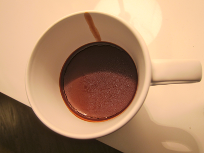 Chill overnight.  This simple dessert tastes amazingly decadent, and will surely impress your guests.  The sweet sherry complements the bitter chocolate, and the coconut milk gives the Pot du Coco(nut) a beautifully velvety texture.  Our non-paleo dinner guests loved the Pot du Coco(nut), and thought it paired very nicely with the minimally sweet flour-less cake.  Since I don’t have many small glasses, I chilled the rest of the chocolate mixture in a mug, which works nicely as well.