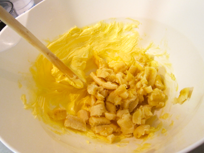 When the butter is creamed, add bananas, one at a time.  We used the back of a wooden spoon to smash the bananas into the butter; blend well.