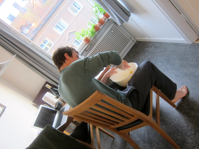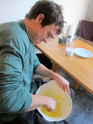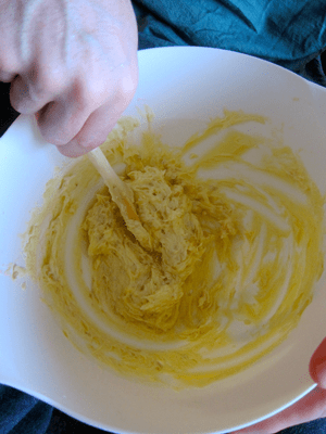 Cream the butter.  Since we don’t have a hand mixer, I had David cream the butter with a wooden spoon — it requires some muscle-ing, but it works fine.