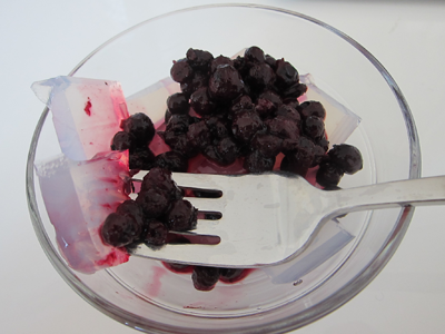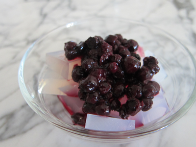 I used agar agar to make almond water jelly cubes!  Like the coconut kanten, this concotion, too, might be an acquired taste.  But these cubes makes for a refreshing, low-calorie dessert option… made from seaweed!  The translucent cubes look quite beautiful when topped with fruit — like wild blueberries cooked down in lemon juice.