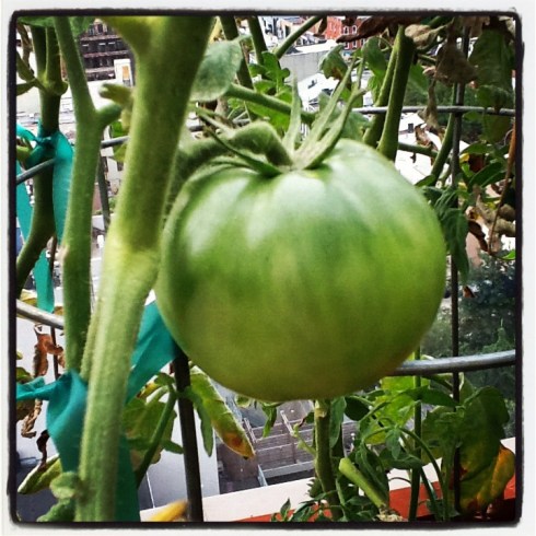 Our garden continues to grow apace. The tomato plants have gotten tall, and so, as they fruit tomatoes and some of their branches weigh down, we’ve had to find ways to secure the plants — we’ve put stakes, tied a couple to the balcony railing itself, and added a cage around one pot. The tomatoes seem sensitive to changes in temperature, and we found a few baby tomatoes sadly rotting… but all in all they look great and there are quite a few tomatoes growing healthfully.