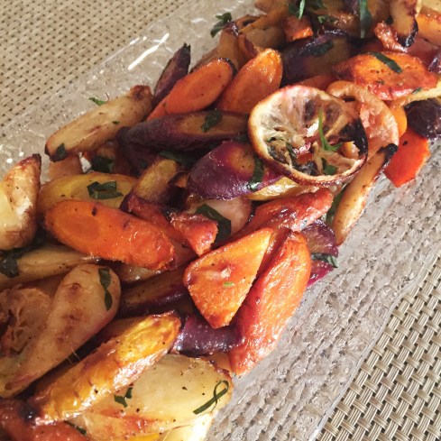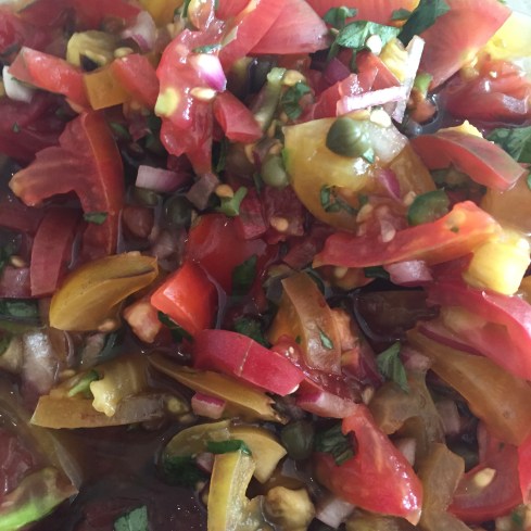 The result? David has declared that butternut squash roasted and tossed together with spicy onions is now his favorite way to eat butternut squash! What really makes the dish is the spicy onions with lime zest, chili, and hint of honey. This spicy onion concoction really brightens the sweetness of the squash. Also, the textures are wonderful: the tenderness of the squash, the crunch of the hazelnuts, the softness of the tangy goat cheese, the aromatic freshness of mint and parsley. I made a few tweaks on the original recipe: I used fresh serrano chili instead of crushed red pepper, because we have chili still growing in our garden; I also used thyme instead of marjoram, because I have thyme in the garden but no marjoram. I had never blanched hazelnuts, but Googled it and found an easy method on eHow (here’s the LINK). I found that the squash took longer to cook than was outlined in the original recipe, but it could be that I didn’t slice the squash quite to size. It’s best to do a fork check — if it goes through the squash easily, then they’re ready! (Full disclosure: As can be seen in the photo, I forgot to “coarsely” chop the hazelnuts — which would be better — but it still worked out fine.) Continue reading →