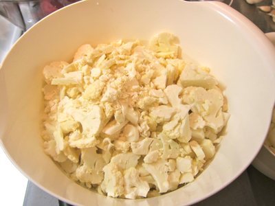 The soup itself is very simple.  First, break down the cauliflower into small pieces.