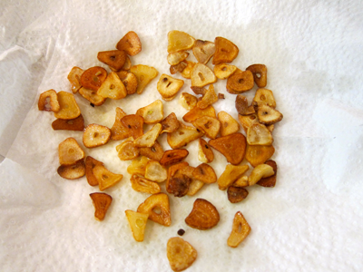 When golden, take the garlic chips out and lay them out on a paper towel over a plate.  Sprinkle with some sea salt.