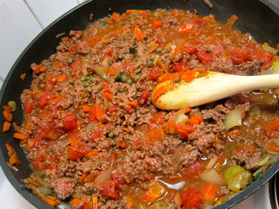When the vegetables are tender, I turn down the heat to about medium. I add a pack of mince meat (like the photo above) into the pan, and with a spatula, I break up the meat and combine it with the vegetables.
