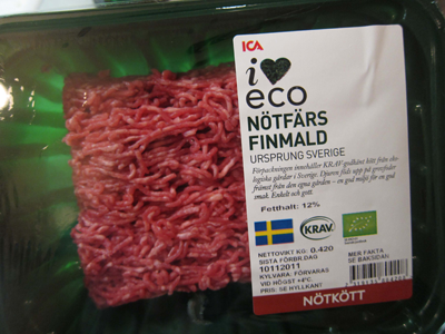 6 NovThe hardest part about grocery shopping in a foreign country, where you don’t speak the language, is understanding what it is that you are buying. Organic items are usually easy to spot — Bio or Eco normally indicate organic products in Europe (biologique or ecologique). In Sweden, too, you see a variety of “Eco” or “Eko” products (Ekologiskt). Recently, I learned that there is another label for organic products established specifically in Sweden — KRAV. Useful information to have, as I don’t think I would have figured this out on my own. After reading various expat internet forums on buying groceries in Stockholm, it seems that organic meats and produce in supermarkets are a relatively new thing here, and that quality varies greatly from one supermarket to another, even within the same chain. We visited the ICA in the NK the other day, where we picked up some nice looking, KRAV ground beef.