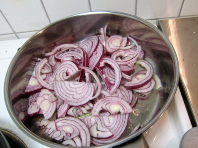 Thinly slice 3 red onions and finely mince 3 garlic cloves. In a saute pan, heat about a tablespoon of olive oil. When hot, add the onions. Salt, stir, and turn down the heat to medium-low. Sprinkle fresh thyme leaves (take the leaves off the sprig). Put a lid on the pan and let the onions cook down.