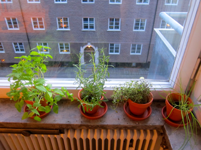 I like having potted herbs on hand — they help give a furnished-rental a more cozy, homey vibe — I currently have organic Thai basil, chives, rosemary and thyme.