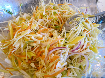 I made this coleslaw to go with the spiced ribs.  I wanted to infuse some sweetness to the salad to complement the spicy ribs — and had the idea to add mango into the mix.  The mango adds a faintly sweet, slightly tart quality to the coleslaw, and brightens the salad.  It’s colorful and flavorful, and pairs very nicely with the spicy ribs.  This coleslaw was a big hit at the birthday party — what a great way to get a solid vitamin C boost from the cabbage!  The coleslaw is excellent the next day.
