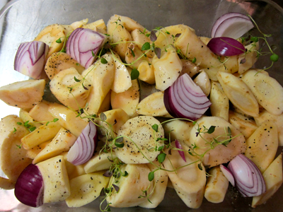 Cover tightly with foil, and put in the oven.  After about 20 minutes, take off the foil.  Toss the parsnips/onions/garlic, and continue to roast for another 20 minutes or so, until tender.  I like to keep moving the vegetables, so that they brown evenly.  If you want to crisp up the edges, broil for 5 minutes at the end.