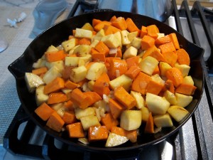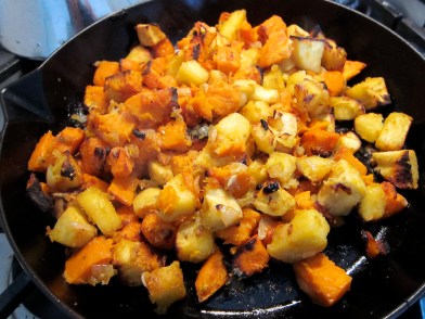 Put the skillet in the oven to finish cooking.  (Note: I discovered that the Japanese sweet potatoes cook faster than the yams, which I didn’t expect.)  Stirring occasionally, cook until the yams are cooked and a fork goes easily through it.  You might want put it under broil it for a few minutes to brown the potatoes a little more.  Adjust the seasoning if needed.